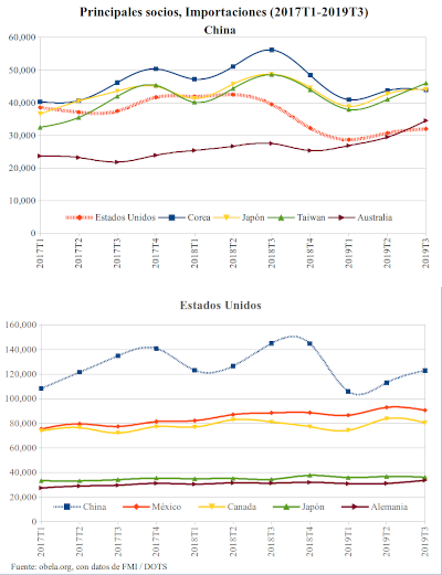 Al comenzar la guerra, el déficit estadounidense con China equivalía al 47% de su balanza comercial. Las principales importaciones de EEUU provenían de: China, México, Canadá y Japón, en ese orden. En cambio, el superávit chino con EEUU, para 2017, representaba cerca del 62% del total; y sus principales compras provenían de Corea, EEUU, Japón y Taiwan. Aunque las dos economías eran principales socios proveedores de importaciones, el contenido de éstas era diferente. Mientras China le compraba vehículos de transporte (carga y aéreo), maquinaria y granos; EEUU importaba equipo de cómputo y maquinaria, manufacturas y productos semielaborados.