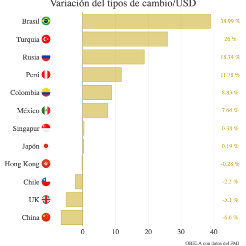 Se observa que las divisas apreciadas pertenecen a países con grandes mercados financieros, como el Renminbi Chino y el Yen Japones, las monedas de mercados emergentes y extraterritoriales mantienen un nivel similar al anterior a la pandemia y las de los mercados con mas dificultades son aquellas que se mantienen depreciadas.
