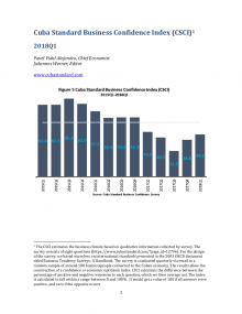 El Índice de Confianza Empresarial Estándar de Cuba (CSCI, por sus siglas en inglés) mejoró levemente, por segundo trimestre consecutivo, luego de tocar fondo en el tercer trimestre del año pasado en 31.5. El CSCI aumentó 7.4 puntos en el cuarto trimestre de 2017 y, moderadamente, 3.4 puntos en el primer trimestre de 2018.
